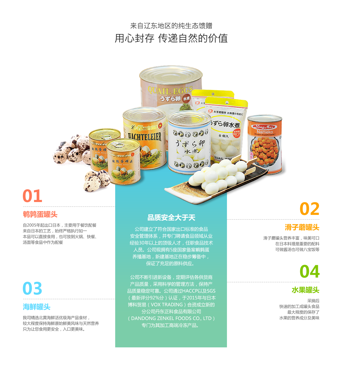 丹東日食食品有限公司是一家專注罐頭及速凍生產(chǎn)的食品加工型企業(yè)。公司主要產(chǎn)品為鵪鶉蛋罐頭、滑子蘑罐頭、冷凍產(chǎn)品等,年產(chǎn)量約5000噸。其中,鵪鶉蛋罐頭出口量位居近年國內(nèi)之冠;滑子蘑罐頭出口量也列國內(nèi)前位。各種產(chǎn)品主要出口日本,并遠銷德國、澳大利亞、新加坡等國家和地區(qū)。